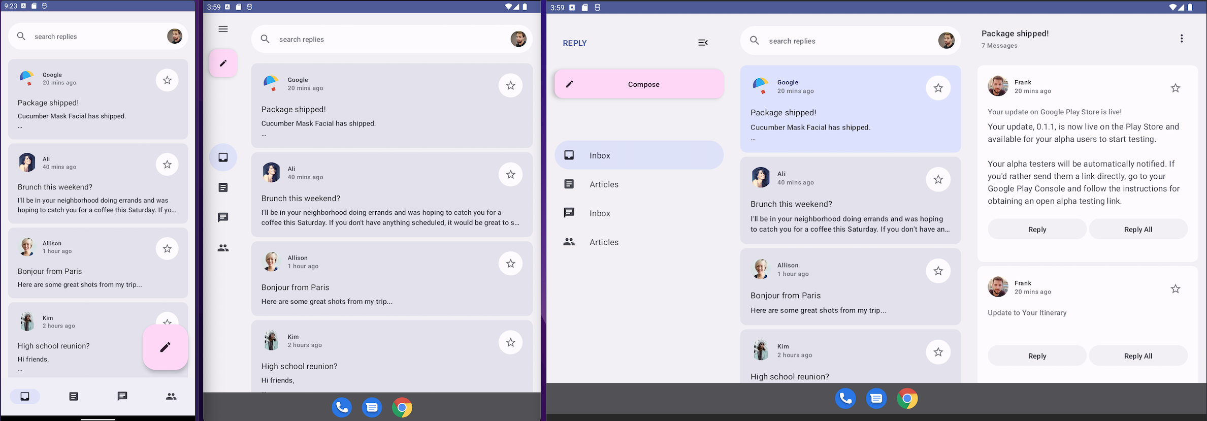 Reply is using all material 3 components including different type of FAB for different screen size and states.